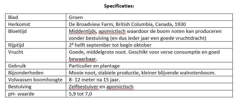 De walnotenboom ‘Broadview’ is een Canadese selectie uit 1930, gevonden op de Broadview Farm in British Columbia, Canada. Het ras ‘Broadview’ wordt al decennia in Nederland aangeplant en produceert goed in ons klimaat. Het blad is groen en kleurt geel naarmate de herfst toetreedt. De boom loopt in het voorjaar vrij vroeg uit met roodgroene twijgen. De bloei is middentijds en de boom is zelfbestuivend door apomixie. De noten zijn middelgroot en vallen vanaf de 2e helft van september tot begin oktober. De noten zijn voor verse consumptie en om te bewaren. De walnotenboom Broadview is zowel geschikt voor particuliere tuinen als in plantages en zal uiteindelijk zo’n 8 tot 12 meter hoog worden, wat kleiner is dan andere notenbomen en dus toepasbaar is op allerlei standplaatsen. Tevens zeer vroeg vruchtbaar.
